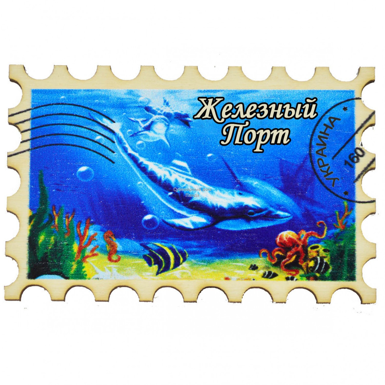Марка — магніт No1 "Стая дельфінів" Залізний Порт. Друк прямий і повноколірний, так само не блякне за прямого сонячного світла.